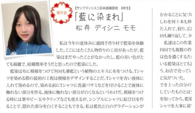 Eighth grader Momo Matsui-Disini recently received an Excellence Award in an essay contest held by BaySpo, Northern California’s most circulated Japanese-language newspaper.
