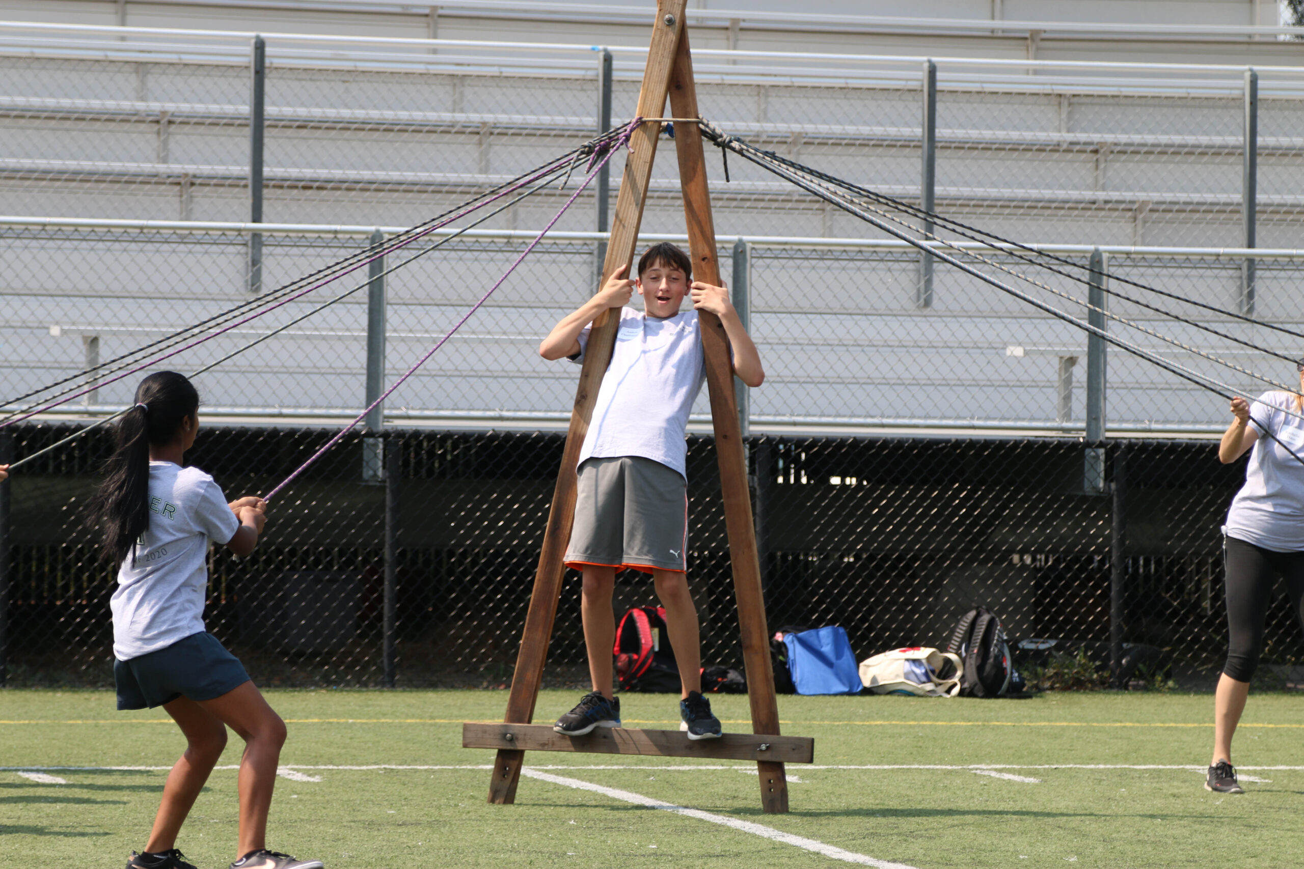 After meeting with their advisors, the freshmen headed to Davis Field and the adjacent Singh Aquatic Center for a series of fun team-building activities organized by APEX Adventures. In one activity, students helped a team member walk on the field using a triangular apparatus, which was propped up by ropes held by the students’ teammates. In another, students had to fill a tube of water by using their fingers to plug holes in its side.