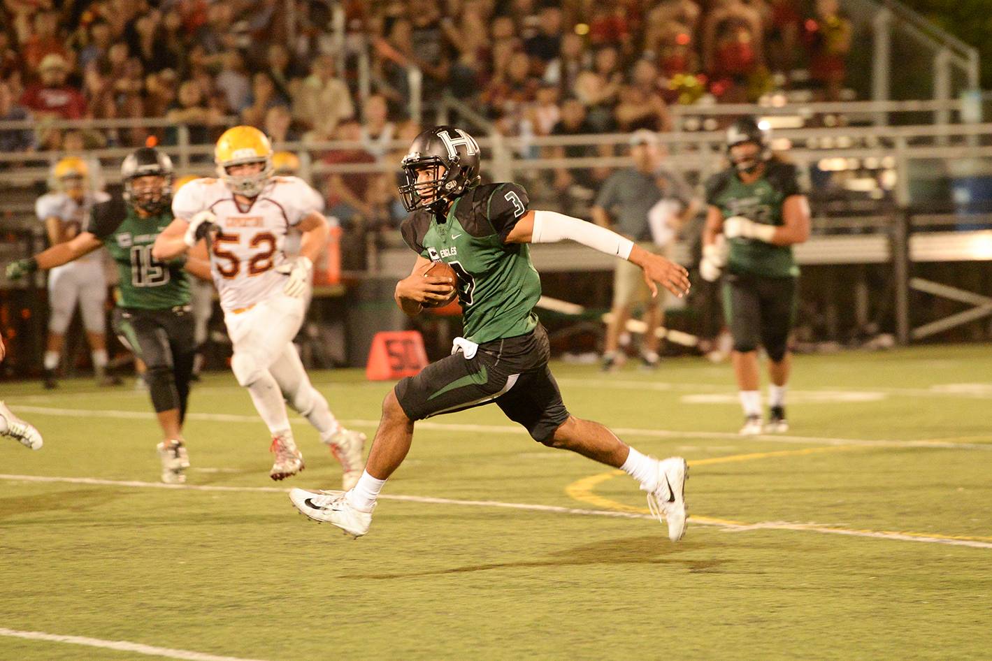 The Eagle football team executed another dominating performance Friday as it defeated visiting Cupertino 35-0 in front of a packed Davis Field crowd. Dominic Cea, grade 12, connected on two field goals and hit his three extra points; Nate Kelly, grade 12, rushed for a touchdown and passed another to Floyd Gordon, grade 12; Aaron Smith, grade 11, rushed for 160 yards and two touchdowns; and the Harker defense once again played huge! Check out highlights from 49ers Cal-Hi Sports starting at 3:58: https://www.youtube.com/watch?v=B5NOhVhkPss
