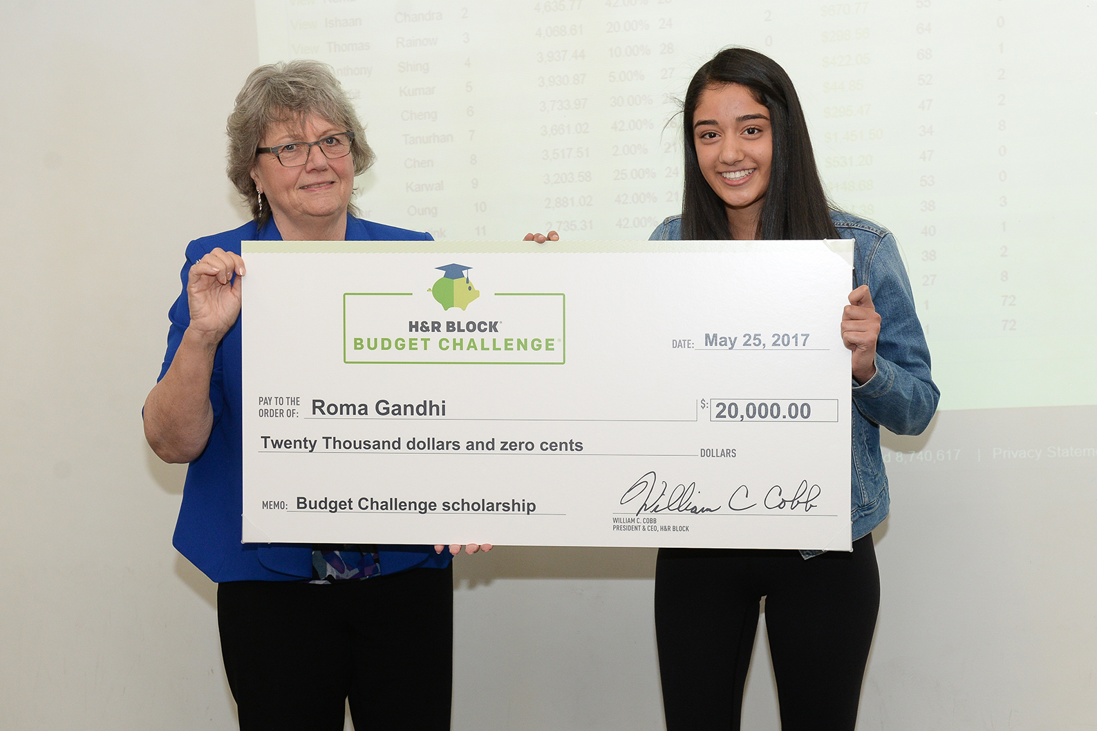 Harker business and entrepreneurship student Roma Gandhi, though only in grade 9, is set to manage a household budget, having won a $20,000 scholarship from H&R Block in its annual Budget Challenge. Gandhi was one of only 10 winners out of 180,000 students nationwide who participated in the challenge. Gandhi collected her oversized check from H&R Block district general manager Marilyn Raisor in front of her cheering classmates in mid-May.