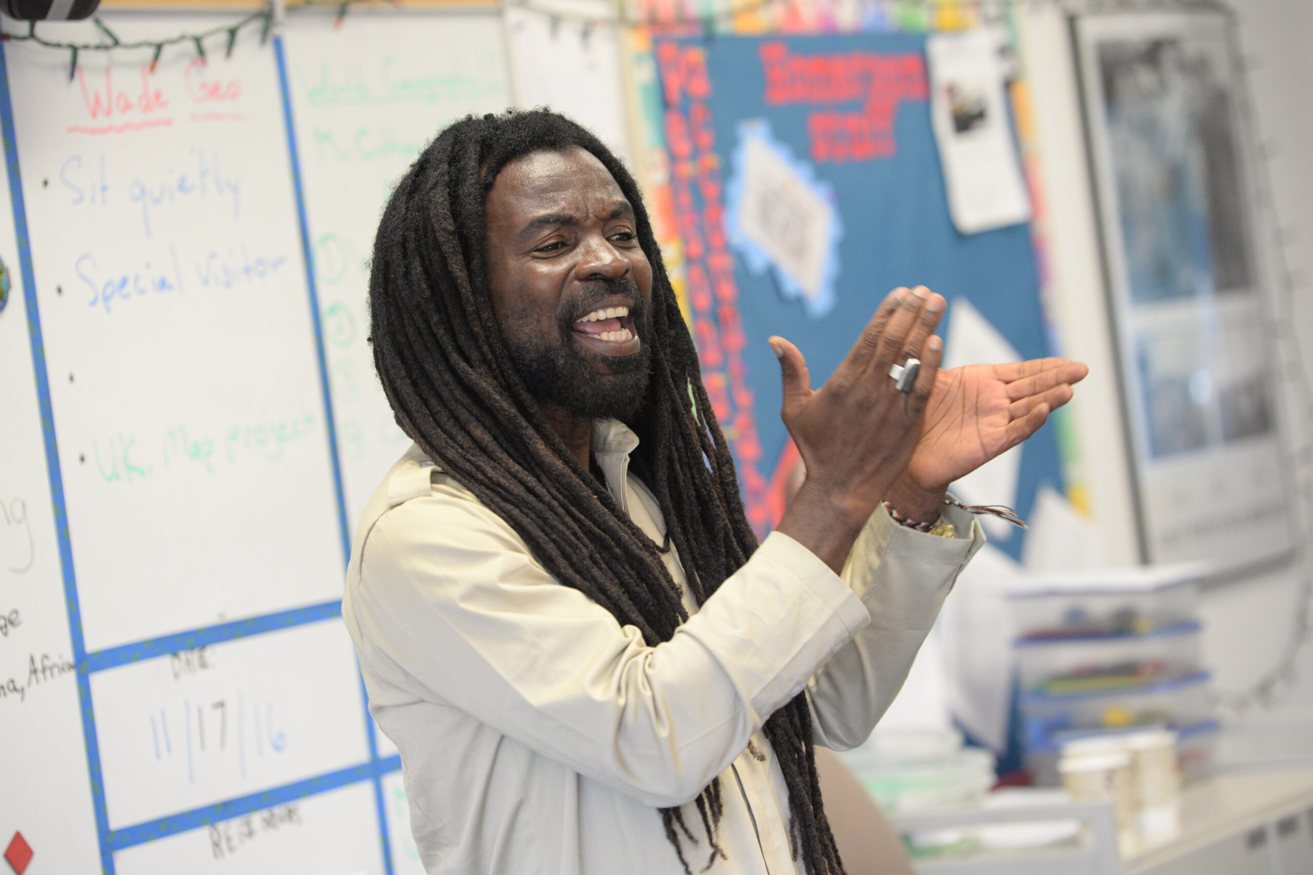 In mid-November, Grammy-nominated Ghanaian musician and activist Rocky Dawuni visited lower school history teacher Tobias Wade’s fourth grade class. Students learned about various aspects of Ghanaian culture, including a board game called oware, a popular dish known as fufu and kente cloth, a type of silk important to Ghana’s history and culture.