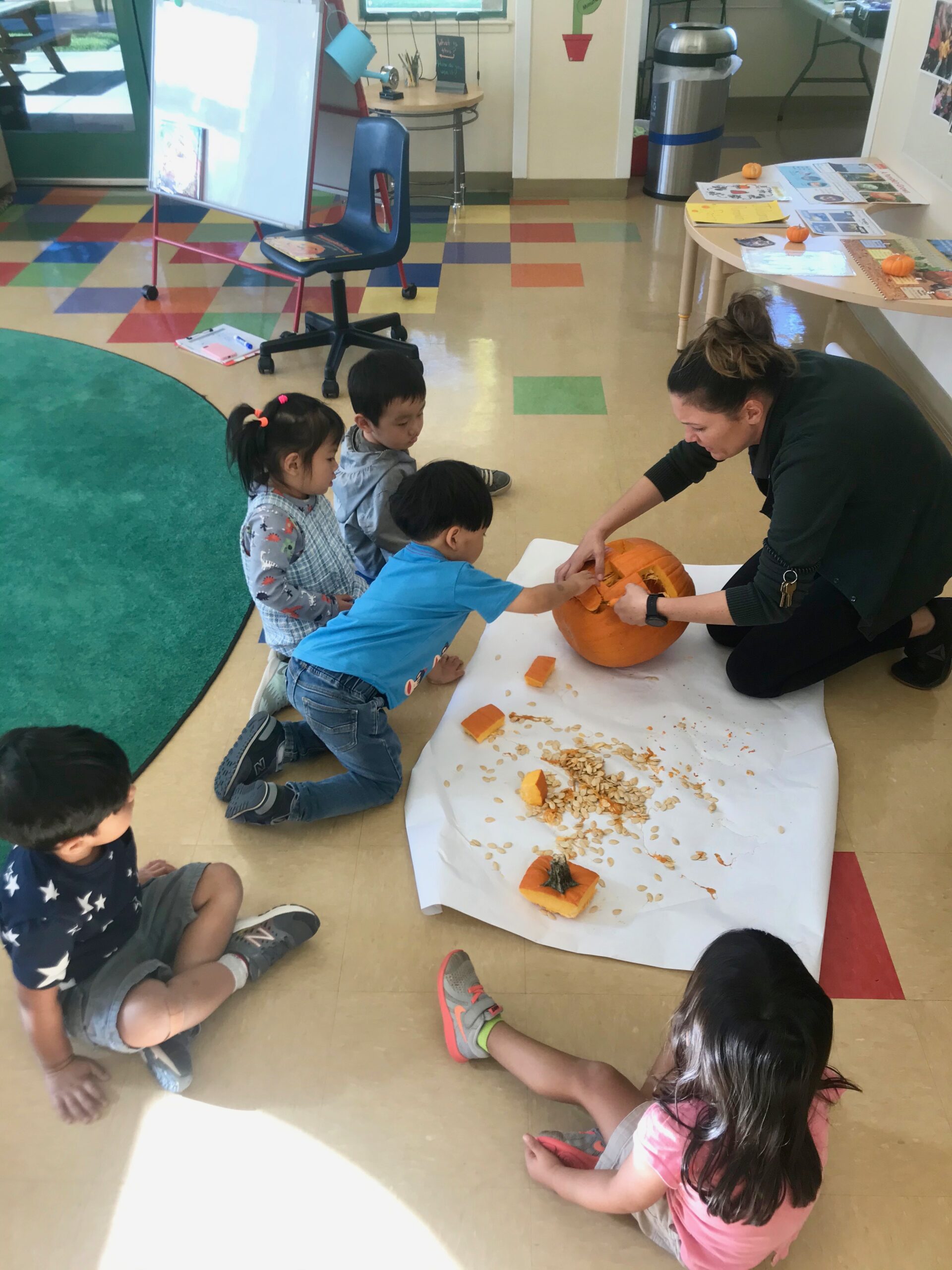 Harker preschoolers enjoyed a delightful pre-Halloween activity, reading the book “Pumpkin Jack” and carving their own pumpkins!
