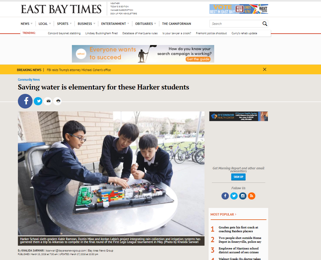 East Bay Times, March 15, 2018: Article on one of our middle school robotics team’s eco efforts.