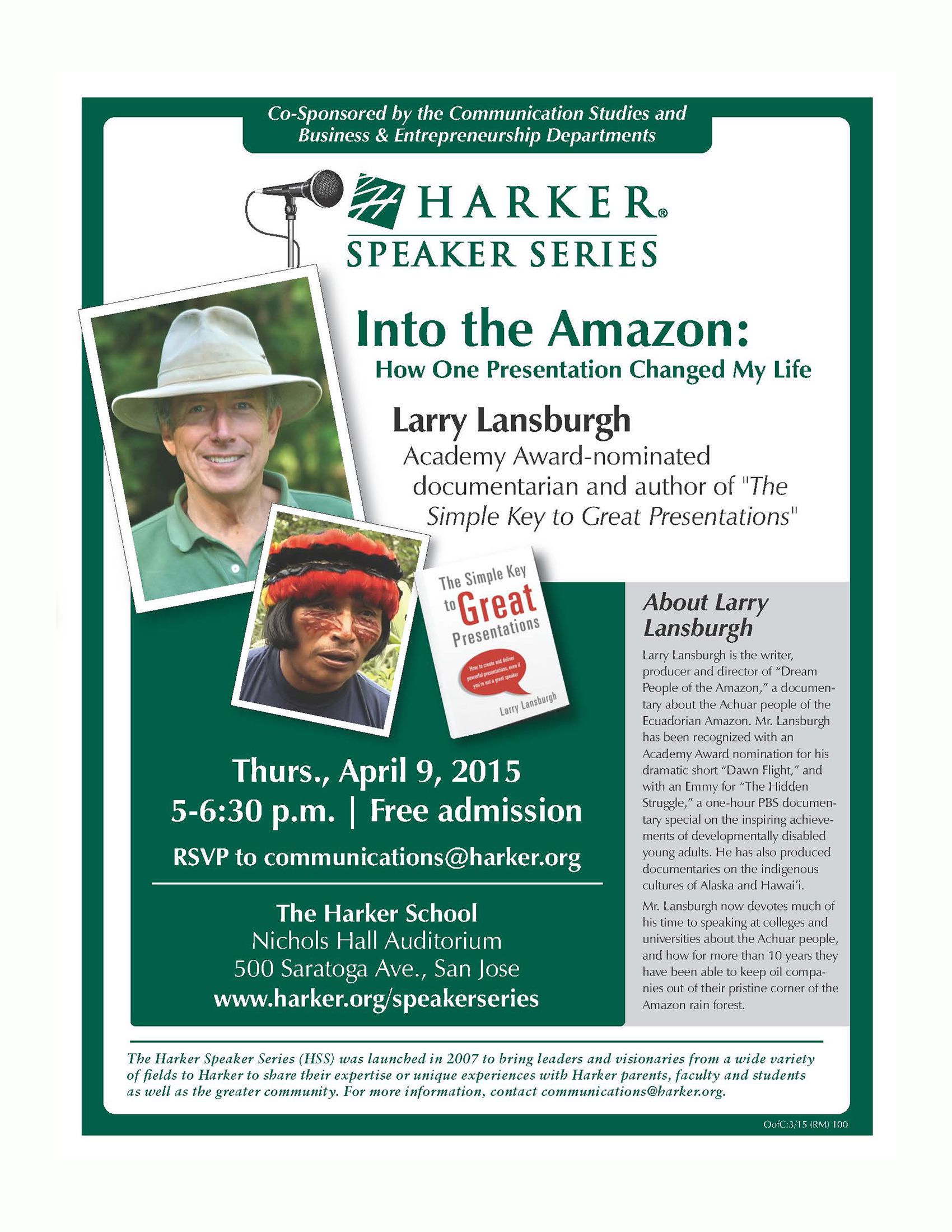 The Harker Speaker Series, co-sponsored by the communication studies and business and entrepreneurship departments, presents documentarian Larry Lansburgh in a talk titled, “Into the Amazon: How One Presentation Changed My Life.”