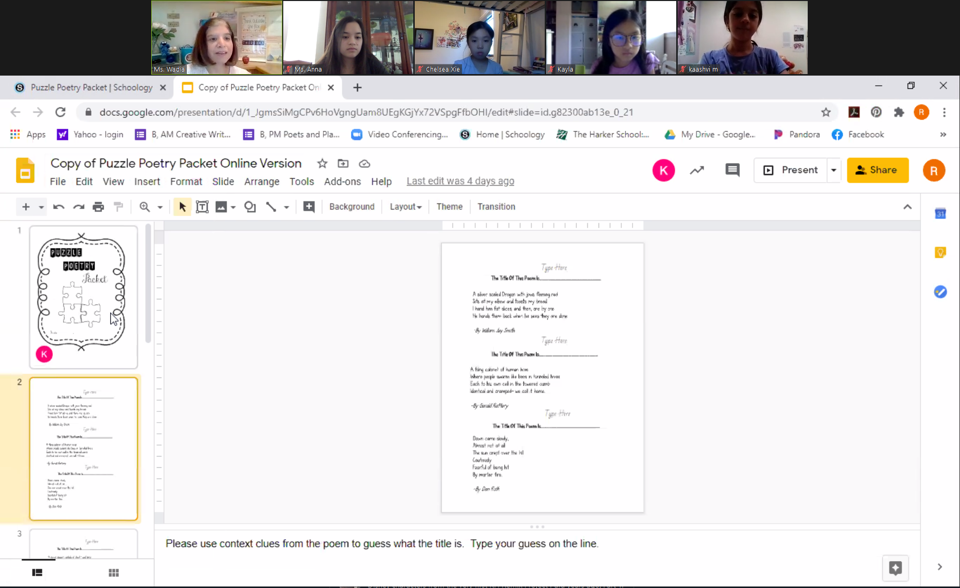The middle school Summer Institute’s Poets and Playwrights class offered students in grades 6-8 fun and engaging ways to learn about the many aspects of creating poetry and plays. Poetry was the focus of the first week of class, as students studied the work of Langston Hughes, Robert Frost, Emily Dickinson and other famous poets. Students learned about different literary devices through fun exercises such as “puzzle poems,” where students read a poem and use what they’ve learned to determine what the poem is describing.