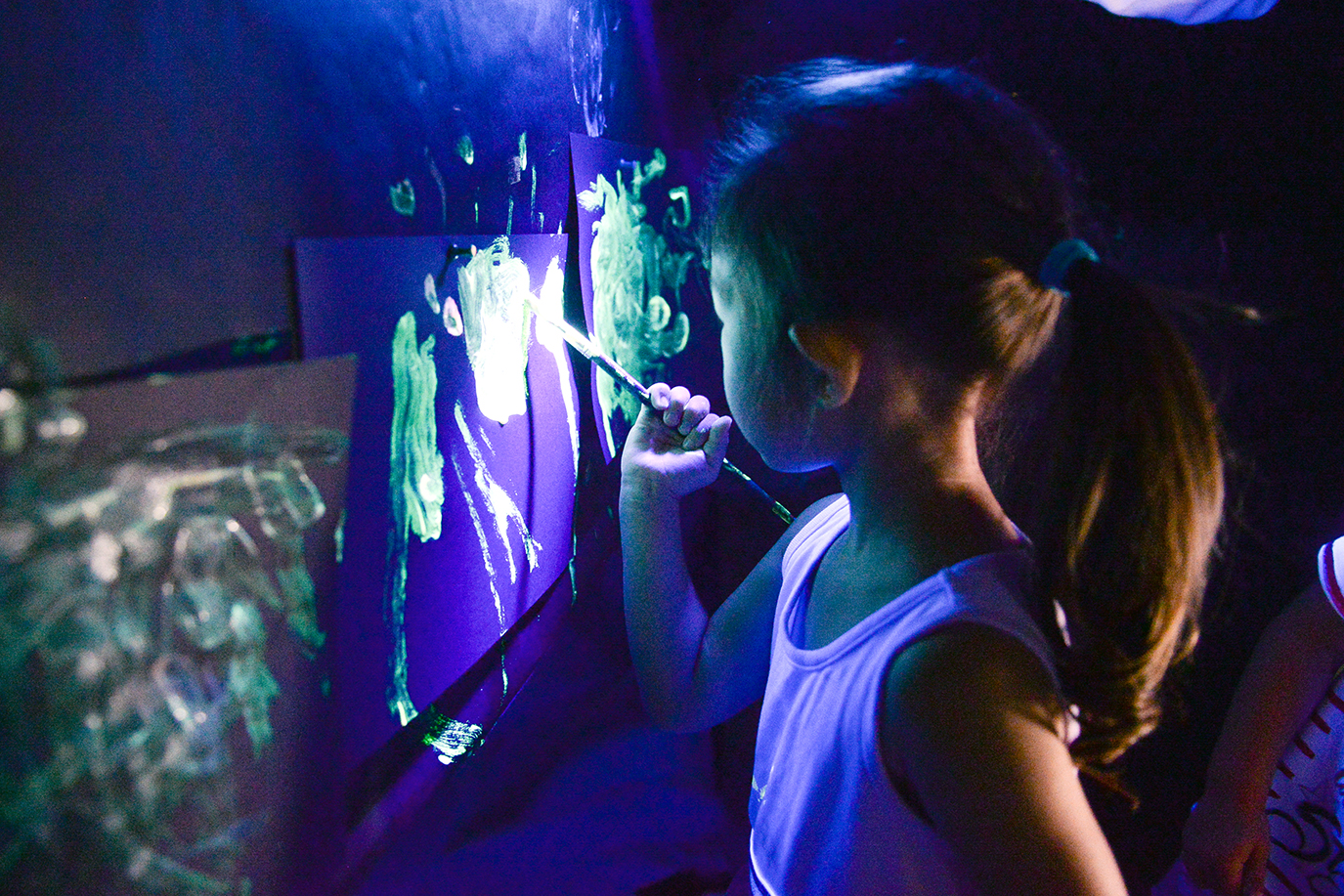 “We turned off the art studio lights, grabbed a lantern and a flashlight and traveled back in time – and we saw a cave in the corner of the room! We entered and looked for some kind of painting similar to what we saw in the present. After 30 seconds of searching with a flashlight, the kids shouted, ‘There!’ and we found a handprint and a bison. It was glowing! I asked if they also wanted to paint their handprints on the walls and they used similar glow-in-the-dark paints to do so. We left the cave and returned to the future with our new paintings from the cave to take home and make glow in the dark,” he finished. What a great outing!
