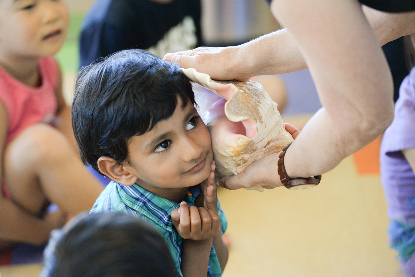 In the musical portion, “The children had the opportunity to bang on pots and pans, always fun, but this time the props were in water,” so students could discover the difference in underwater sounds, explained Beckerman.