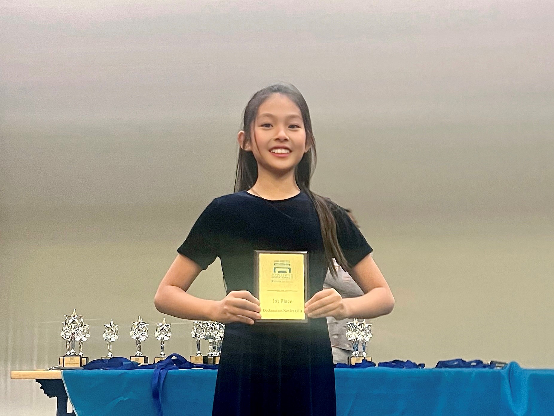 Last month, Fiona Yan, grade 6, took first place in the declamation novice category at the John Lewis Silicon Valley Urban Debate League Invitational, held at Silver Creek High School. The event was attended by more than 1,000 people representing more than 100 schools. In the final declamation novice round, Yan competed against five high school students to take the top spot.