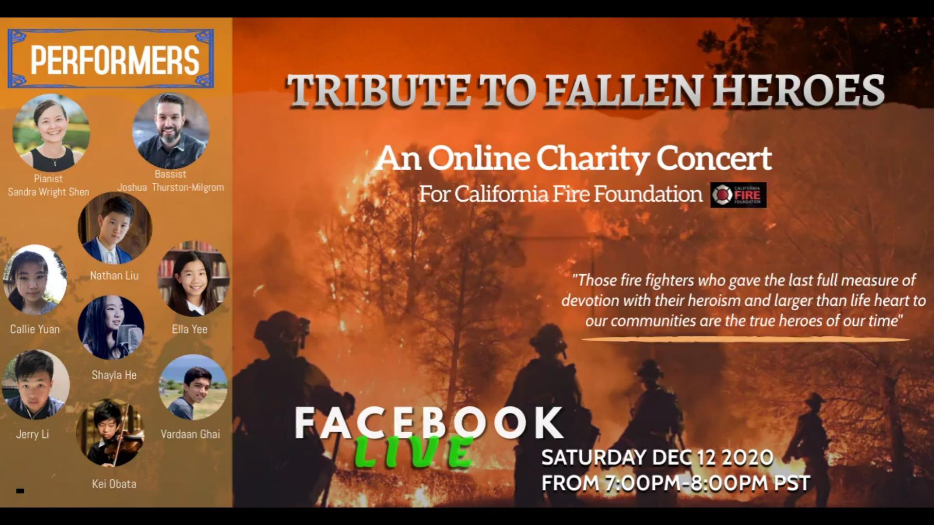 On Dec. 12, a special online charity concert will be held to raise funds for the families of firefighters who lost their lives battling the deadly wildfires that have burned across California since August. The concert, organized by Nathan Liu, grade 9, will be broadcast on Facebook.