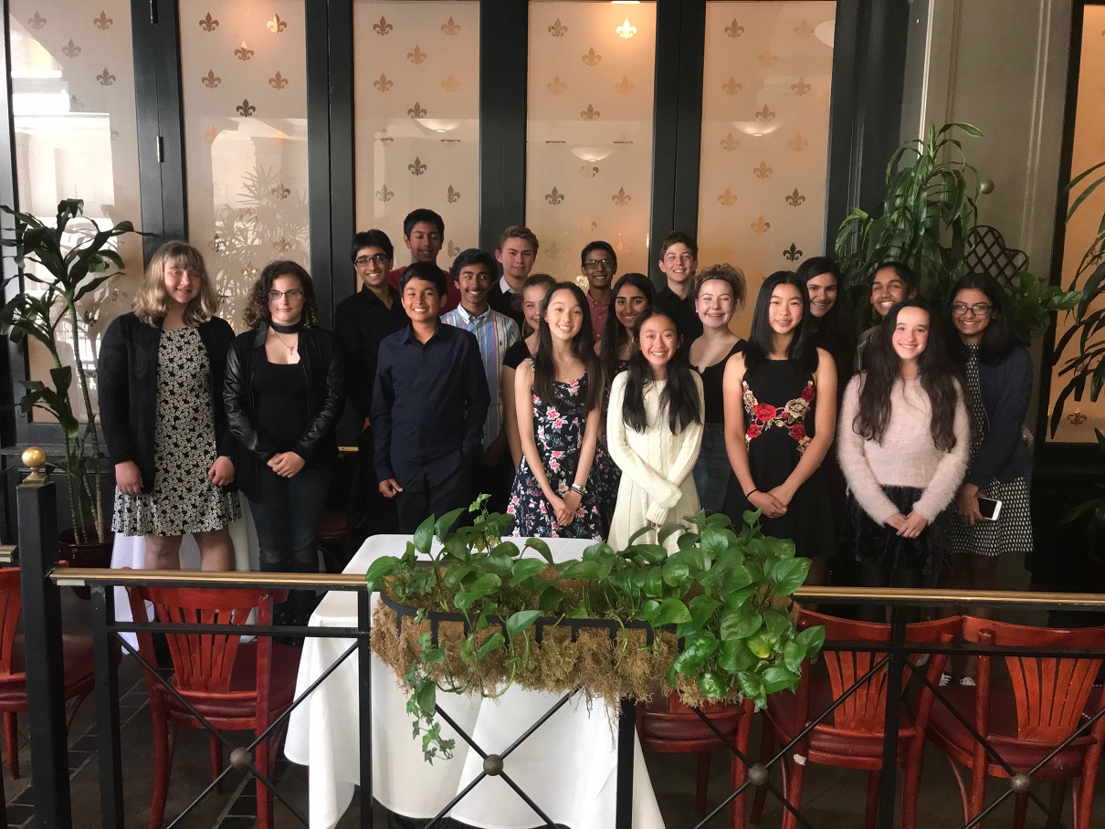 In mid-April, middle school French teacher Carol Parris and her French 2M students visited the Left Bank restaurant at Santana Row for a taste of French food and culture. “We had a leisurely meal in the les Amis room, a lovely private dining room,” Parris said. Students enjoyed appetizers of French bread and fries while waiting for their orders to arrive. “I believe that the most popular luncheon was the croque monsieur, a French grilled ham and cheese sandwich, served with a salad, but the chicken and vegetarian pasta received a thumbs up as well,” Parris said. Not surprisingly, the dessert of two profiteroles (pastry shells with a vanilla ice cream filling and chocolate sauce topping) proved to be the most popular menu item among students.