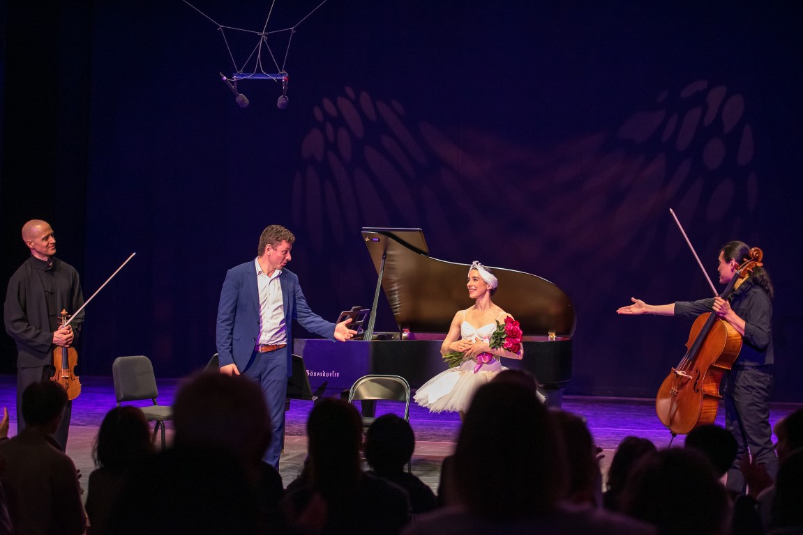 Cellist Jonah Kim and Julia Rowe – accompanied by pianist Dominic Cheli and violinist Moni Simeonov – played (and danced) for a near-capacity crowd at the Patil Theater.