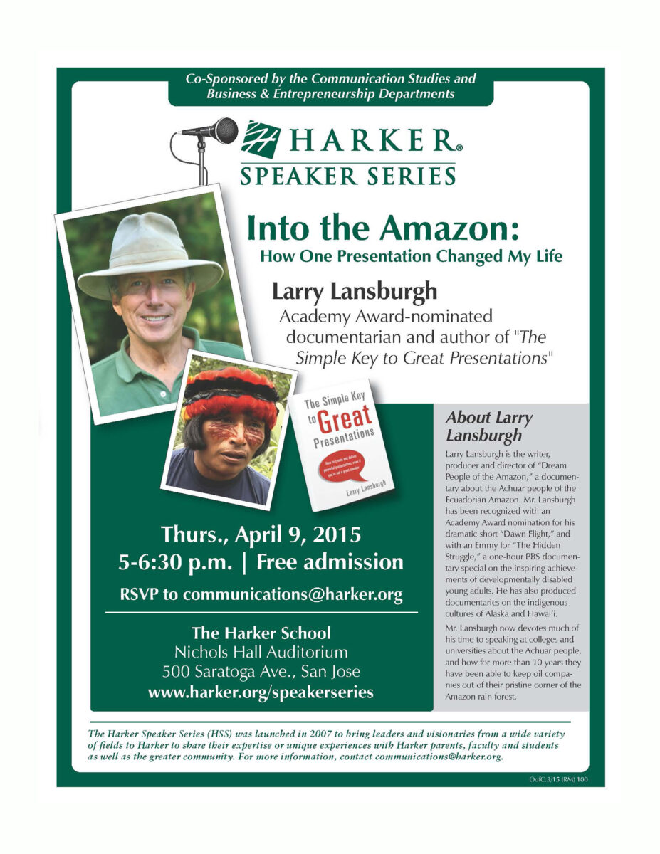 The Harker Speaker Series, co-sponsored by the communication studies and business and entrepreneurship departments, presents documentarian Larry Lansburgh in a talk titled, “Into the Amazon:…
