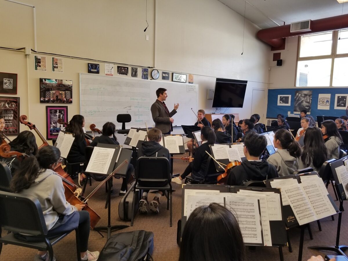 On Monday, middle school music students received a visit from Brad Hogarth, band and orchestra director at San Francisco State University.