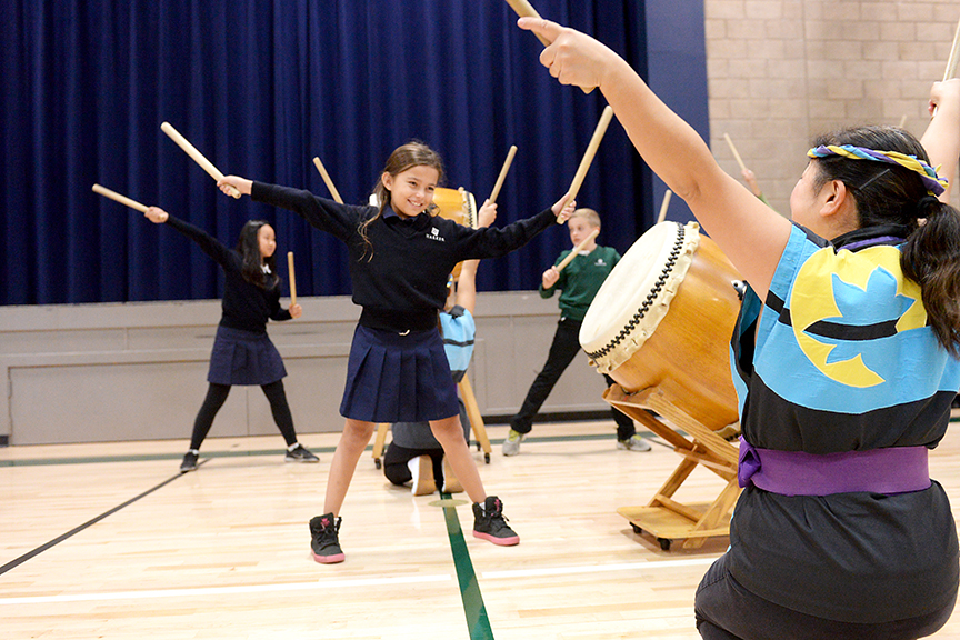 San Jose Taiko returned to the lower school campus on Wednesday, treating students to a pair of entertaining and educational assemblies about this Japanese rhythmic art form.