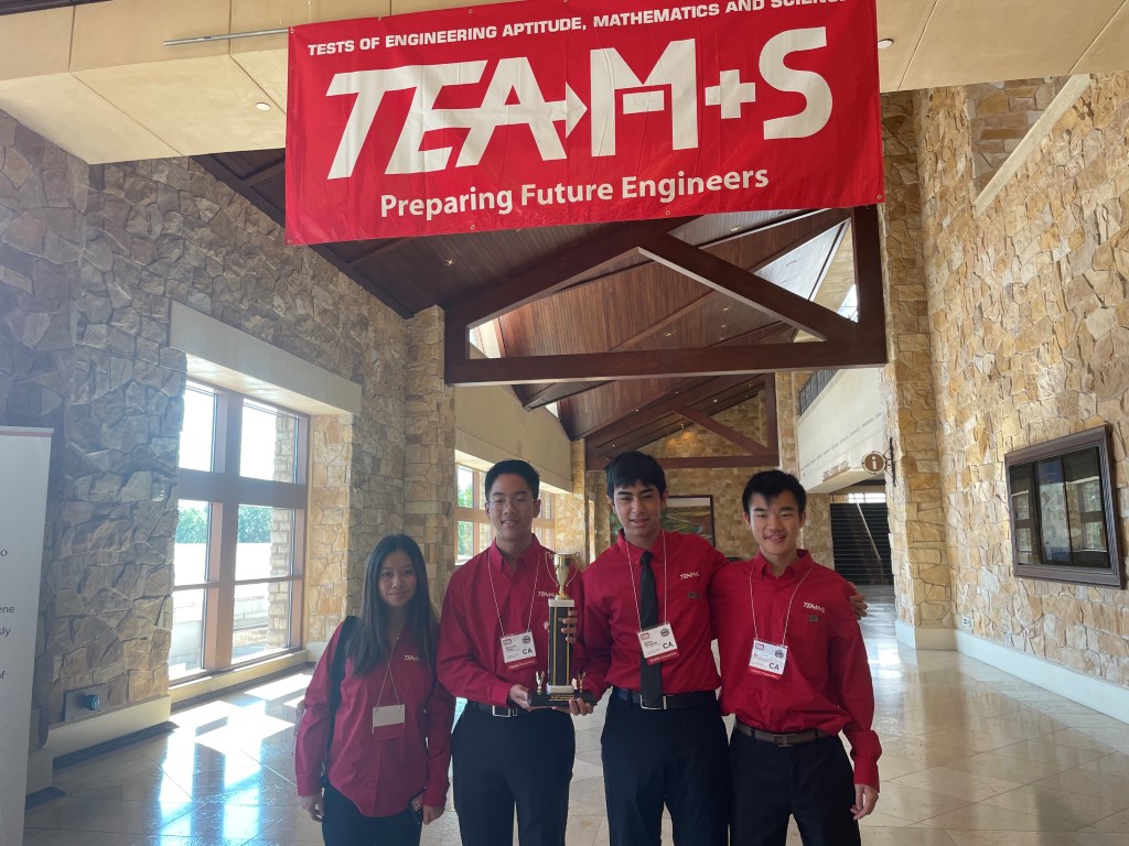 The team of Alex Hu ’22 and rising seniors Rohan Bhowmik, Anthony Tong and team captain Sabrina Zhu performed admirably at the finals of the 2022 Tests of Engineering, Aptitude, Mathematics and Science (TEAMS) Competition, which took place in late June in Dallas.